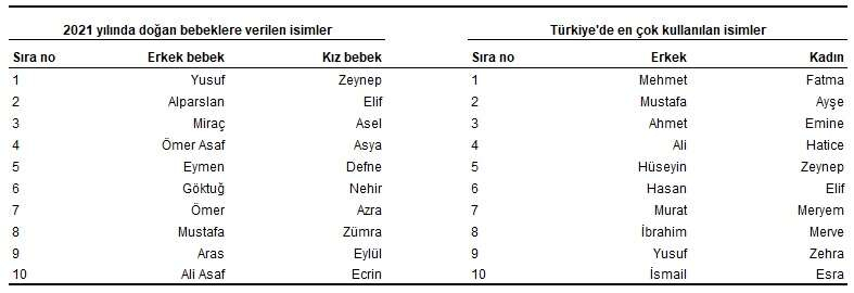 Ülkemizde 2021 yılında doğan bebeklere verilen isimler incelendiğinde, erkeklerde Yusuf, kızlarda ise Zeynep isminin ilk sırada yer aldığı görüldü. Türkiye nüfusu içinde cinsiyete göre en çok kullanılan isimler incelendiğinde ise erkeklerde Mehmet, kadınlarda da Fatma isminin ilk sırada olduğu gözlendi.