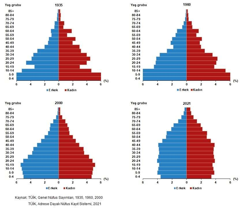 TÜİK verilerine göre Türkiye'nin 1935, 1960, 2000 ve 2021 yılı nüfus piramitleri incelendiğinde, sağlık alanında kaydedilen gelişmelere, yaşam standardının ve refah düzeyinin artmasına bağlı olarak doğurganlık ve ölümlülük hızlarının azalması ve doğuşta beklenen yaşam süresinin artması ile nüfusun yaş yapısının şekil değiştirdiği görüldü. Bu duruma bağlı olarak yaşlı nüfus artmış, ortanca yaş yükselmiş, çocuk ve gençlerin toplam nüfus içindeki oranı azalırken; Türkiye, oransal olarak yaşlı nüfus yapısına sahip ülkelere göre hala genç bir nüfus yapısına sahip olsa da, yaşlı nüfus sayısal olarak oldukça fazla olduğu belirlendi.