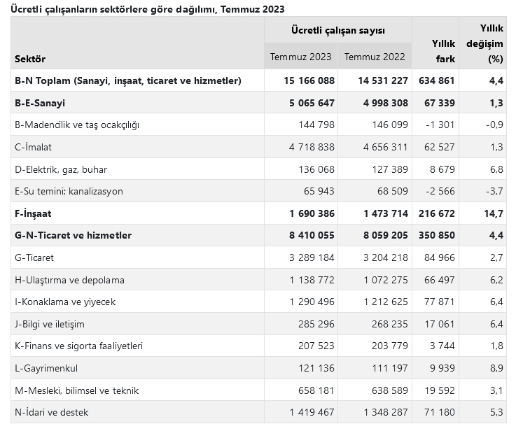 Buna göre, sanayi, inşaat ve ticaret-hizmet sektörleri toplamında ücretli çalışan sayısı Temmuz'da bir önceki yılın aynı ayına göre yüzde 4,4 arttı. Ücretli çalışan sayısı bir önceki yılın aynı ayında 14 milyon 531 bin 227 kişi iken, 2023 yılı Temmuz ayında 15 milyon 166 bin 88 kişi oldu.