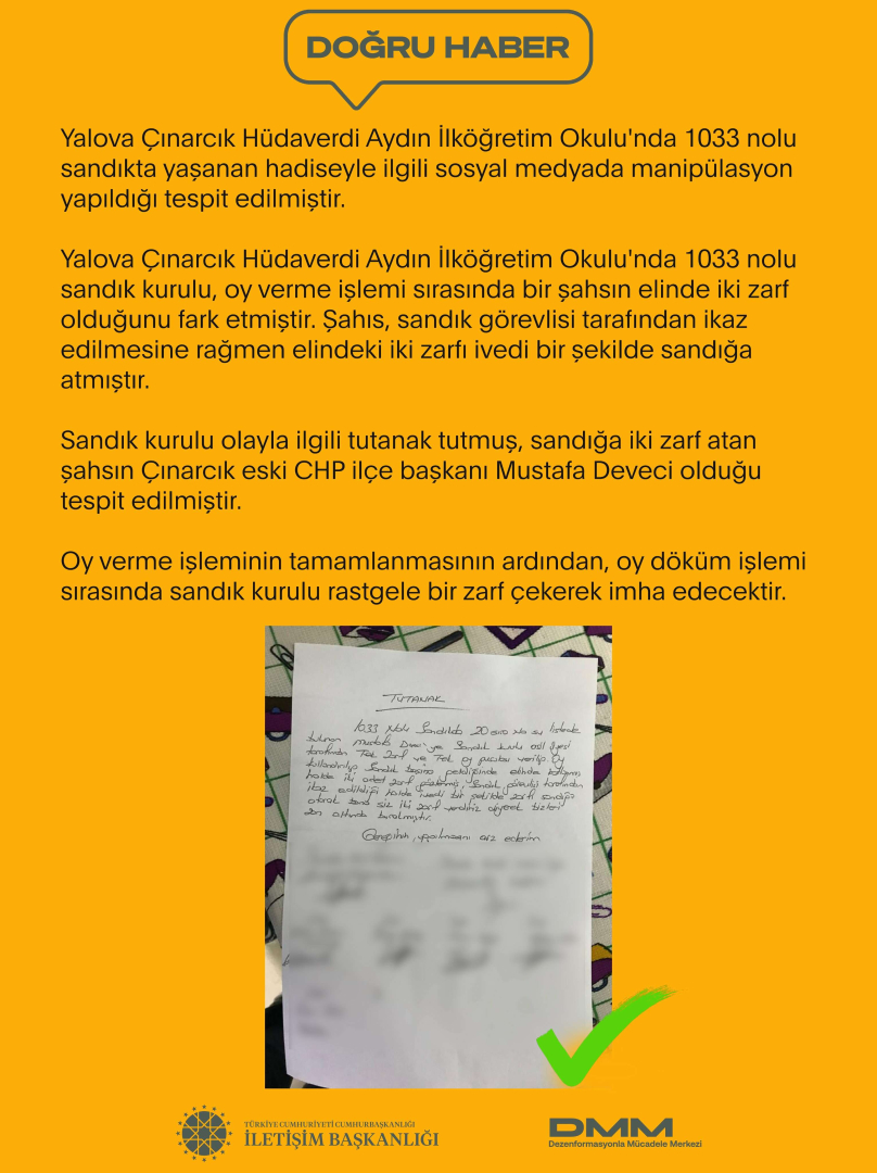 İletişim Başkanlığı Dezenformasyonla Mücadele Merkezi tarafından yapılan açıklamada, Çınarcık Hüdaverdi Aydın İlköğretim Okulu'nda 1033 nolu sandığa iki zarf atan şahsın Çınarcık CHP ilçe eski başkanı Mustafa Deveci olduğunun tespit edildiğini duyurarak, sandık kurulunun olayla ilgili tutanak tutulduğunu bildirdi.