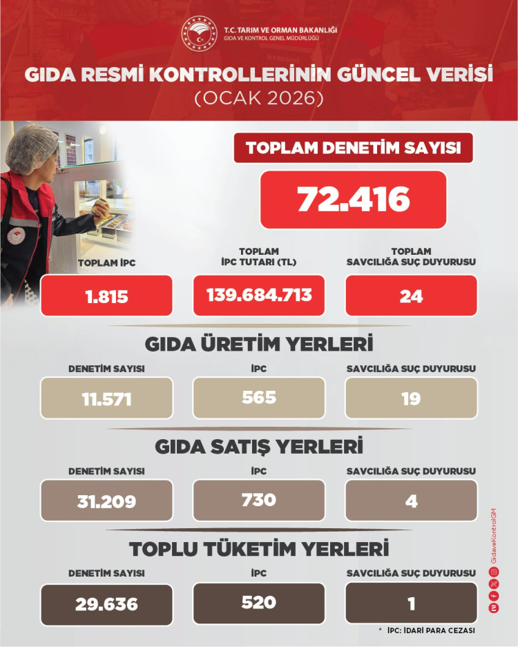 Gıda ve Kontrol Genel Müdürlüğü, Ocak 2026 döneminde gerçekleştirilen gıda denetimlerine ilişkin verileri paylaştı. Yapılan resmi kontrollerde 1.815 işletmeye idari para cezası uygulanırken, 24 dosya savcılığa intikal ettirildi.
