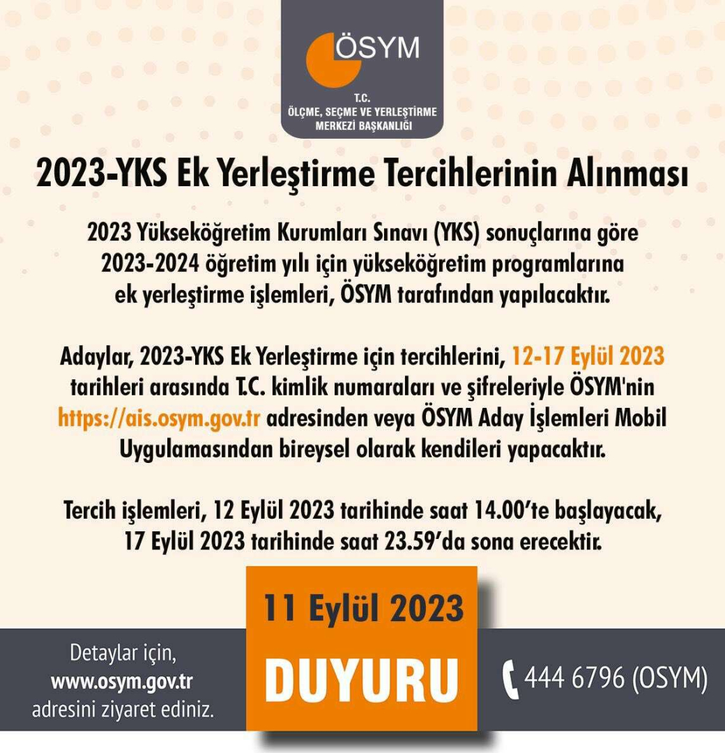 Konuyla ilgili ÖSYM'den yapılan yazılı açıklamada, "12-17 Eylül 2023 tarihleri arasında T.C. kimlik numaraları ve şifreleriyle ÖSYM'nin https://ais.osym.gov.tr adresinden veya ÖSYM Aday İşlemleri Mobil Uygulamasından bireysel olarak kendileri yapacaktır. Tercih işlemleri, 12 Eylül 2023 tarihinde saat 14.00'te başlayacak, 17 Eylül 2023 tarihinde saat 23.59'da sona erecektir. Ek yerleştirme işlemleri, 2023 Yükseköğretim Kurumları Sınavı Kılavuzu, 2023-YKS Yükseköğretim Programları ve Kontenjanları Kılavuzu ile 2023-YKS Yükseköğretim Programlarına Ek Yerleştirme Kılavuzu'nda belirtilen kurallar doğrultusunda yapılacaktır" ifadeleri yer aldı.