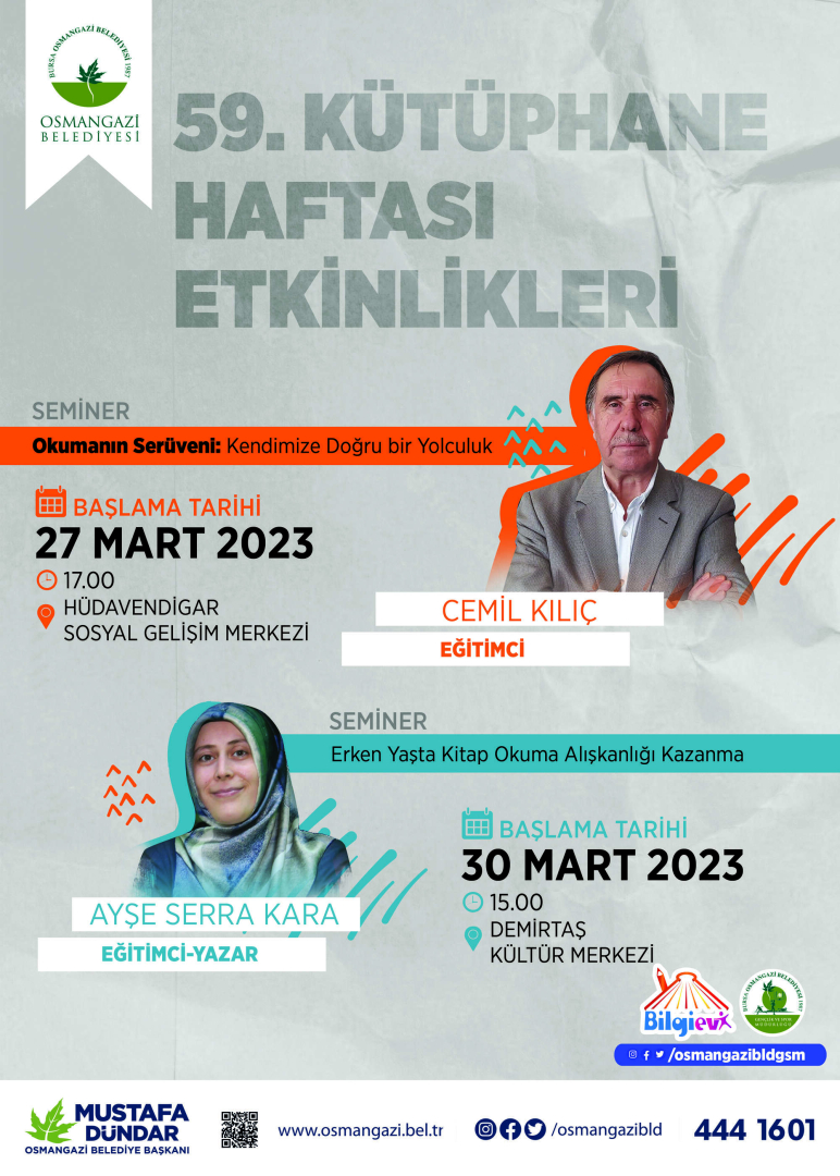 Sosyal belediyecilik alanında önemli çalışmalar yürüten Osmangazi Belediyesi, 59. Kütüphane Haftası kapsamında 7’den 77’ye her yaş grubuna hitap edecek çok zengin bir program hazırladı.