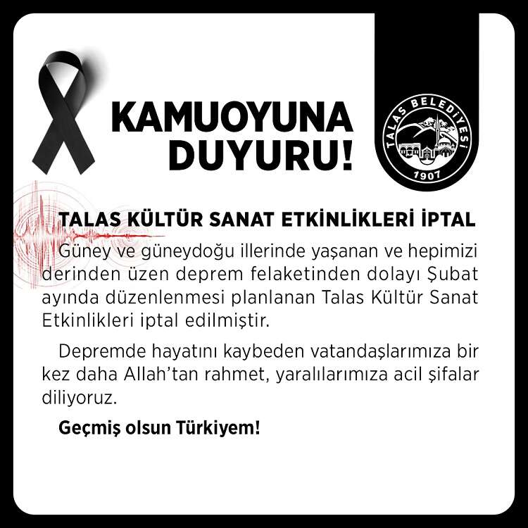 Talas Kültür Sanat etkinlikleri, Kahramanmaraş’ın Pazarcık ilçesinde meydana gelen 7,7 büyüklüğündeki şiddetli depremin ardından iptal edildi.