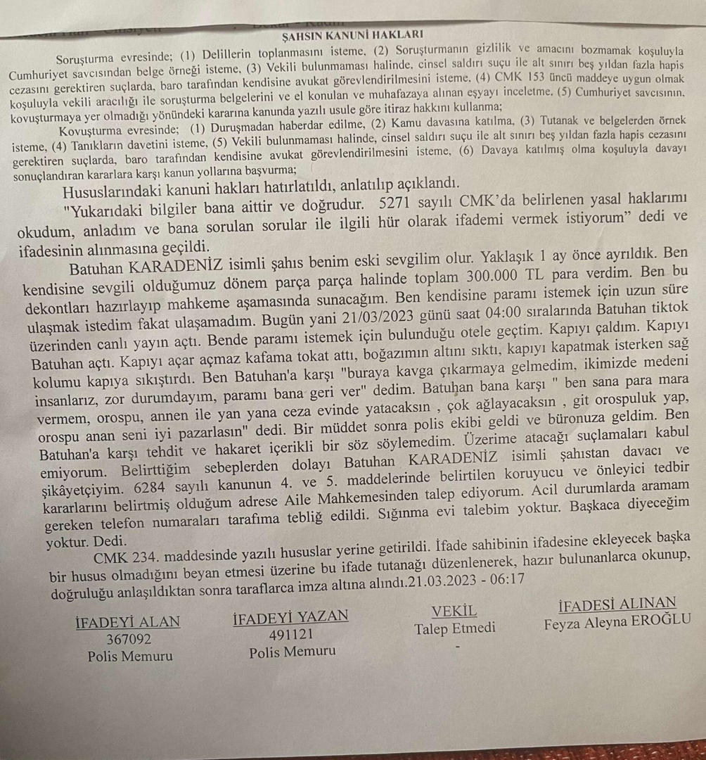 Futbolcudan davacı olan Aleyna Eroğlu, futbolcuya verdiği 300 bin lirayı istediğini bunun karşılığında darp edildiğini ve her türlü rapor ve ispatla avukatıyla dava açmak için işlemlere başladıklarını vurguladı.