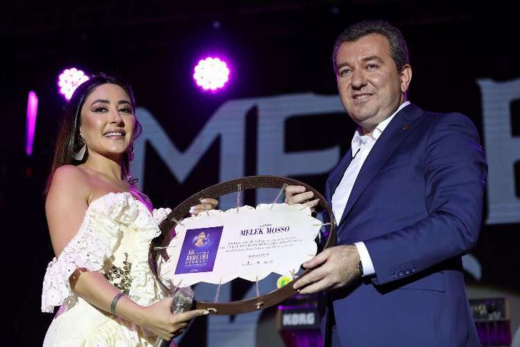 Sanatçı Melek Mosso’ya plaket veren Başkan Hakan Koştu, muhteşem konser için teşekkür etti.