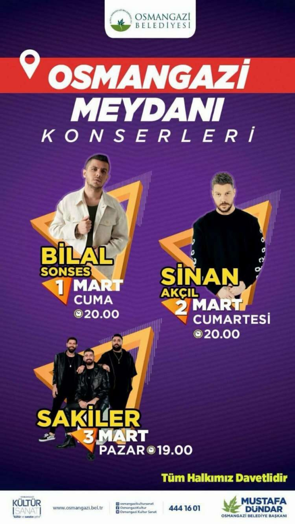 Bursa’nın yeni cazibe merkezi olan Osmangazi Meydanı’nda 1 Mart Cuma günü Bilal Sonses, 2 Mart Cumartesi günü Sinan Akçıl, 3 Mart Pazar günü Sakiler, 8 Mart Cuma günü Aydilge ve 9 Mart Cumartesi günü ise Semicenk ücretsiz konser verecek.