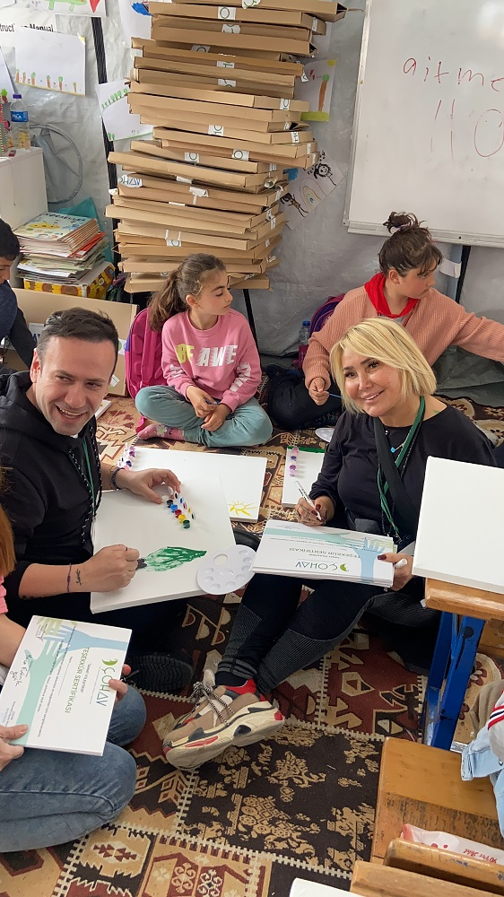 Yonca Evcimik, İrem Derici, Atakan Işıktutan ve Özgür Aras Hatay’da Çadır Kentte yaşayan 400 çocukla gün boyu resim yapıp, oyunlar oynarken ÇOHAV (Çocuk Hastalıkları Araştırma, Önleme ve Tedavi Vakfı) Mütevelli Heyeti Başkanı Abide Gülel ‘Yonca Evcimik, İrem Derici, Atakan Işıktutan ve Özgür Aras’a teşekkür ederken Çadır Kentte çocukların yaptıkları tüm resimlerin İstanbul’da önümüzdeki ay büyük bir organizasyonla sergi olarak sergileneceğini söyledi.