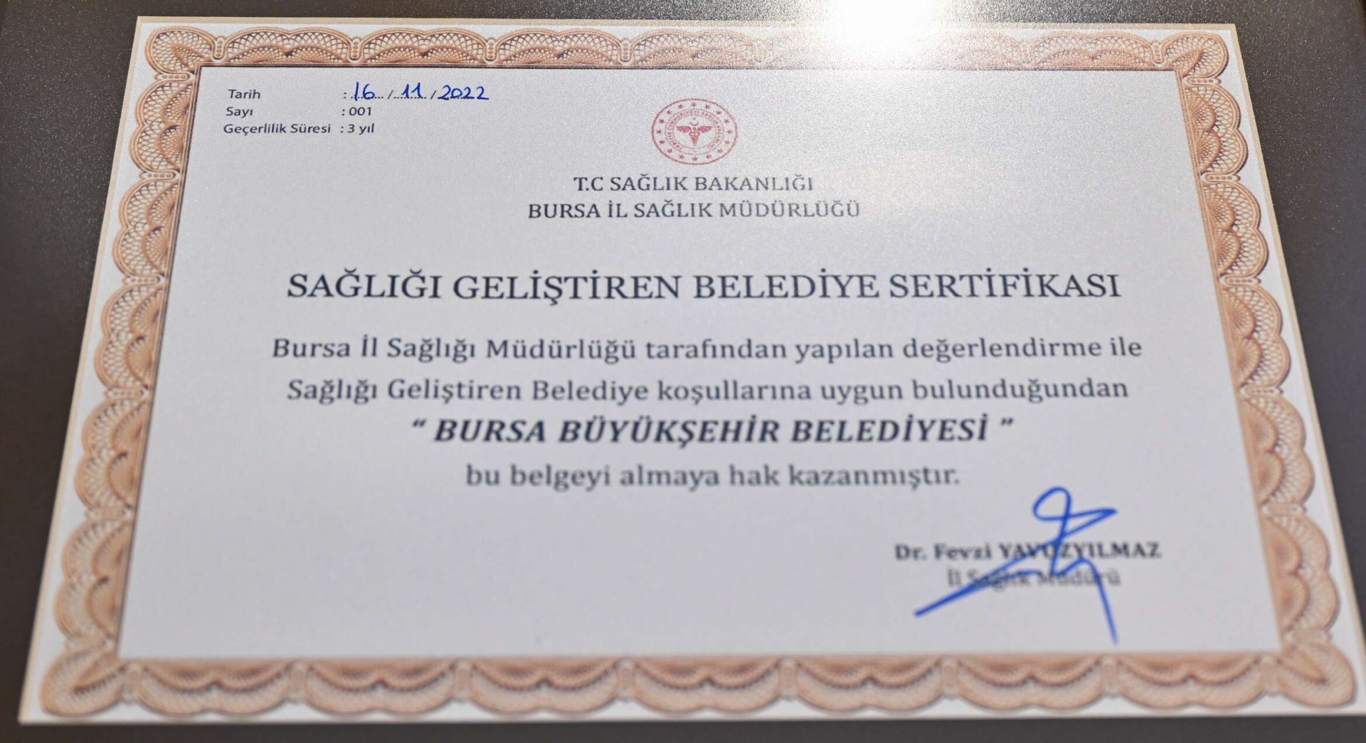 Sağlık Bakanlığı'nın sağlıklı şehir bilinci oluşturmak için başlattığı 'Sağlığı Geliştiren Belediye Belgesi' uygulaması kapsamında Bursa Büyükşehir Belediyesi, bu belgeyi almaya hak kazandı. Türkiye’de bu belgeyi alan ilk Büyükşehir Belediyesi olan, Bursa’da da bu belgeye layık görülen ilk belediye olan Büyükşehir Belediyesi’nin 001 numaralı belgesi, İl Sağlık Müdürü Dr. Fevzi Yavuzyılmaz tarafından Büyükşehir Belediye Başkanı Alinur Aktaş’a teslim edildi.