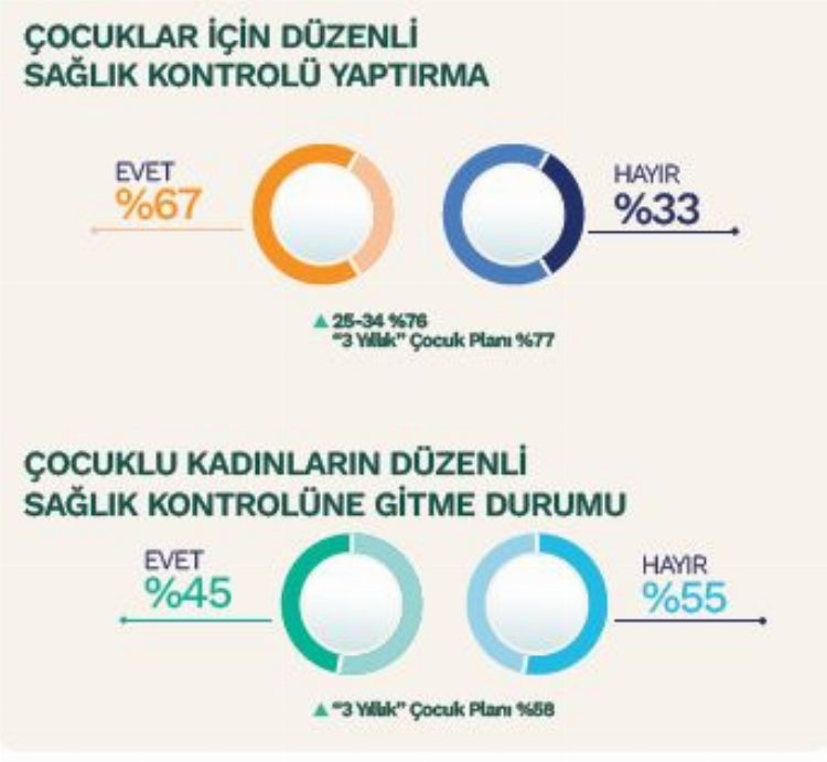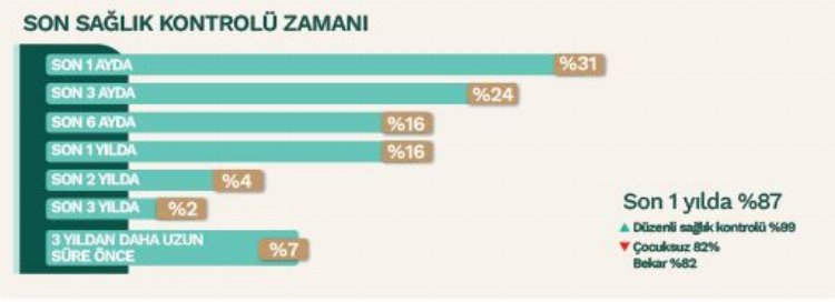 18-54 yaş arasında ABC1C2DE SES (sosyal ekonomik statü) grubu, Türkiye temsili 1235 kadın katılımcının katıldığı araştırmaya göre kadınların yüzde 60'ının düzenli sağlık kontrolüne gitmediği; psikolojik sağlık, cinsel yolla bulaşan hastalıkların kontrolü, menopoz ve osteoporoz gibi konulara daha az öncelik verdiği görüldü. Ankete katılanların yüzde 67'si çocuklarını düzenli sağlık kontrolüne götürürken, kendileri için sağlık kontrolü yaptıran annelerin oranı yüzde 45 oldu.