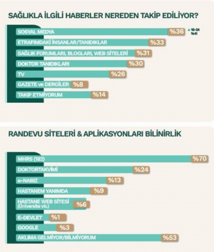 Katılımcılara doktorları nereden araştırdıkları da soruluyor. Doktor ararken katılımcıların yüzde 44'ü tanıdık doktorlara bağlılık göstererek her zamanki doktorlarını tercih ediyor. Yüzde 38'i güvenilir hastaneleri seçiyor, yüzde 29'u tanıdıklarına soruyor ve yüzde 19'u internet yorumlarına bakıyor. Sağlık blogları ve fonlarda araştırma yapanlar ise yüzde 9 ile en sonda yer alıyor.