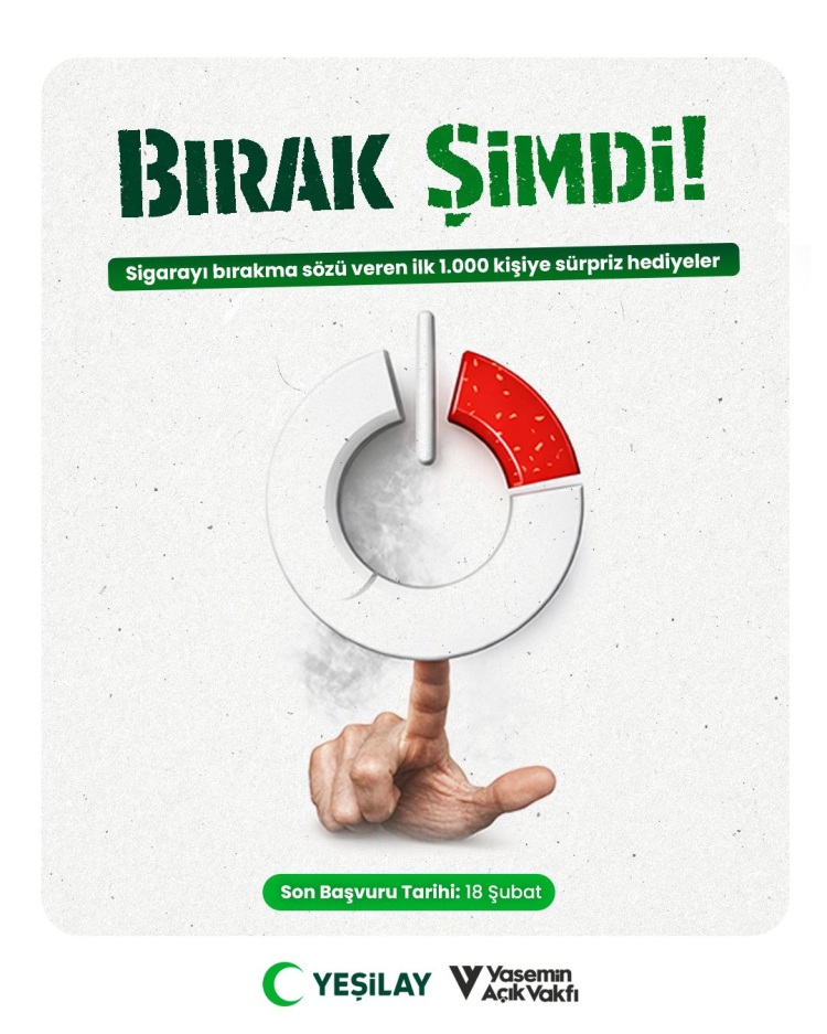 Yeşilay, tütün bağımlılığına karşı toplumsal farkındalığı artırmak ve bırakma sürecine güçlü bir başlangıç yapmak amacıyla “Bırak Şimdi” kampanyasını başlattı. Kampanya kapsamında sigarayı bırakma sözü veren ilk 1000 kişiye hediyeler verilecek.