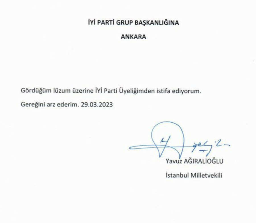 Yavuz Ağıralioğlu, istifa dilekçesinde "Gördüğüm lüzum üzerine İYİ Parti üyeliğimden istifa ediyorum. Gereğini arz ederim" ifadeleri yer aldı.