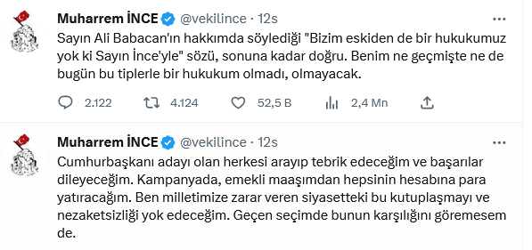 Muharrem İnce, paylaşımında, "Sayın Ali Babacan'ın hakkımda söylediği "Bizim eskiden de bir hukukumuz yok ki Sayın İnce'yle" sözü, sonuna kadar doğru. Benim ne geçmişte ne de bugün bu tiplerle bir hukukum olmadı, olmayacak" ifadelerini kullandı.