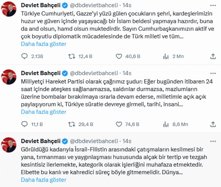 Bahçeli, paylaşımlarında; "Eğer bugünden itibaren 24 saat içinde ateşkes sağlanamazsa, saldırılar durmazsa, mazlumların üzerine bombalar bırakılmaya ısrarla devam ederse, milletimle açık açık paylaşıyorum ki, Türkiye süratle devreye girmeli, tarihi, insani ve inanç sorumluluğunun gereği her neyse yapmalıdır. Gazze’yi koruma ve kollama misyonunu üstlenmek bize ecdadımızın mirasıdır. Türkiye Cumhuriyeti, Gazze'yi yüzü gülen çocukların şehri, kardeşlerimizin huzur ve güven içinde yaşayacağı bir İslam beldesi yapmaya hazırdır, buna da and olsun, hamd olsun muktedirdir. Sayın Cumhurbaşkanımızın aktif ve çok boyutlu diplomatik mücadelesinde de Türk milleti ve tüm inananlar yanındadır" ifadelerine yer verdi.