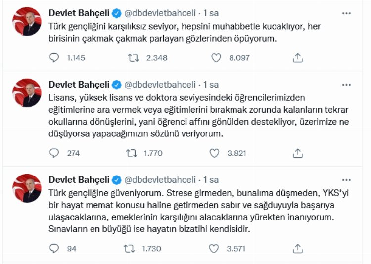 Bahçeli, yakın bir gelecekte YKS'nin kaldırılabileceğini de mesajını verdiği paylaşımında, "Yakın bir gelecekte, üniversite sınavının kaldırılacağına inanıyor, bu husustaki söz ve vaatlerimizin gerçekleşeceğini bu vesileyle açıklıyor, herkesin emin olmasını ümit ve temenni ediyorum" ifadelerini kullandı.