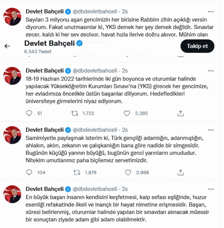 MHP Genel Başkanı Devlet Bahçeli, 18-19 Haziran 2022 tarihlerinde düzenlenecek Yükseköğretim Kurumları Sınavı’na (YKS) girecek gençlere başarı dileklerini sosyal medya hesabından paylaştı.