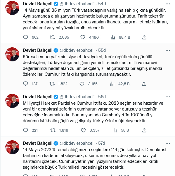 MHP Genel Başkanı Devlet Bahçeli, sosyal medya hesabından, 2023 seçim süreciyle ilgili paylaşımda bulundu.