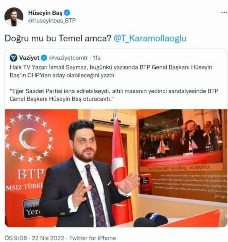 Sosyal medya hesabından yaptığı paylaşımda İsmail Saymaz'ın haberini alıntılayan BTP Genel Başkanı Baş, Saadet Partisi Genel Başkanı Temel Karamollaoğlu'nu da etiketleyerek, "Doğru mu Temel amca" sorusunu yöneltti.
