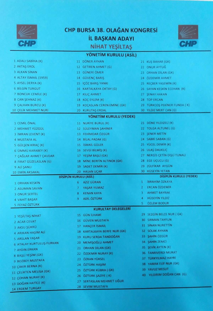 CHP Bursa İl Başkanlığı'nın olağan genel kuruluna üç listeli kongrenin kazananı mavi liste ile yarışan Nihat Yeşiltaş oldu. 599 oyun kullanıldığı genel kurulda Yeşiltaş 323 oy alırken, Gürhan Akdoğan 152 oy aldı. Mevcut il başkanı Turgut Özkan ise 120 oyda kaldığı genel kurulda 4 oy geçersiz sayıldı.