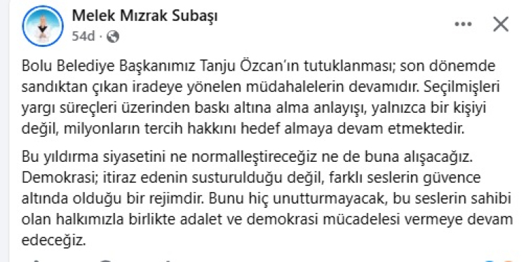 Bilecik Belediye Başkanı Melek Mızrak Subaşı, Bolu Belediye Başkanı Tanju Özcan’ın tutuklanmasına ilişkin yaptığı açıklamada yaşanan süreci “sandık iradesine yönelik müdahalenin devamı” olarak değerlendirdi.