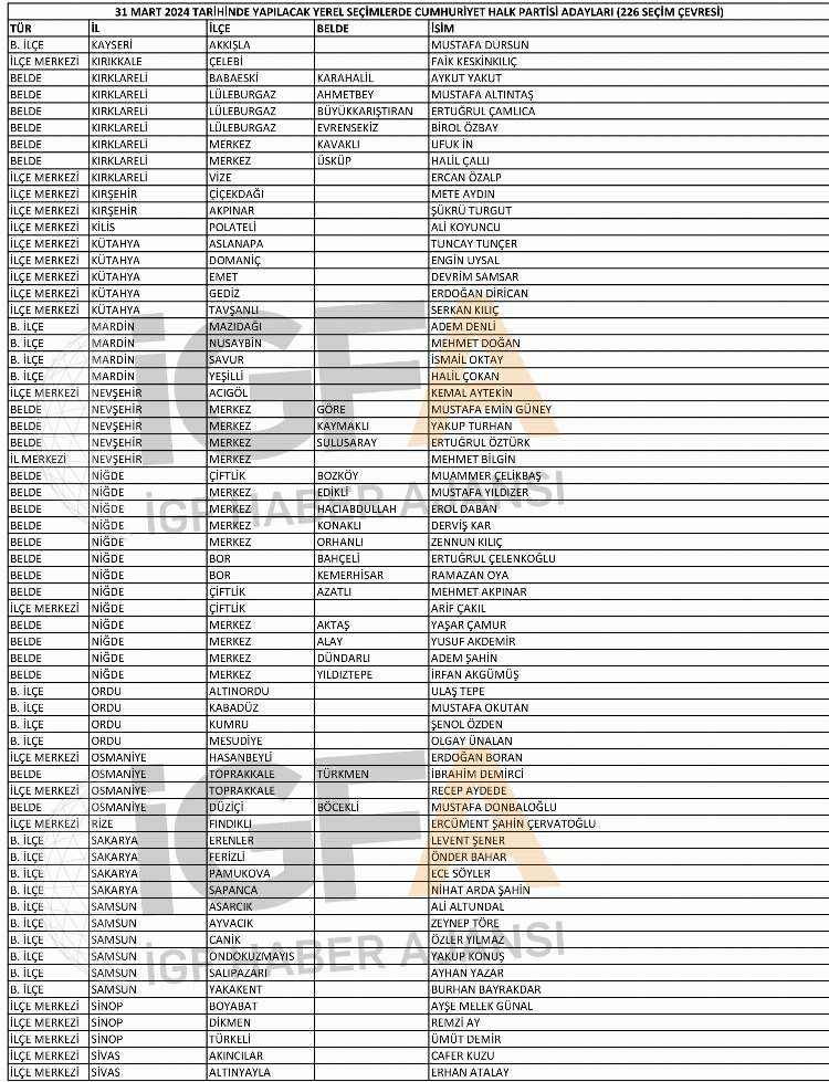 CHP; İstanbul, Ankara, Bursa ve Balıkesir'in olduğu 4 Büyükşehir Belediye Başkan adayı ile 6 il merkezi ile birlikte toplam 227 seçim bölgesinde adaylarını açıkladı.