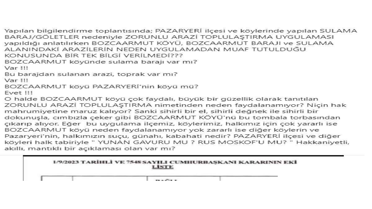“Bozcaarmut köyünde sulama barajı var mı? var !!! bu barajdan sulanan arazi, toprak var mı? var !!! Bozcaarmut köyü Pazaryeri'nin köyü mü? evet !!! o halde Bozcaarmut köyü çok faydalı, büyük bir güzellik olarak tanıtılan zorunlu arazi toplulaştırma nimetinden neden faydalanamıyor? niçin hak mahrumiyetine maruz kalıyor? sanki sihirli bir el, sihirli değnek ile sihirli bir dokunuşla, cımbızla çeker gibi Bozcaarmut köyü'nü bu tombala torbasından çıkarıp alıyor. Eğer bu uygulama ilçemiz, köylerimiz, halkımız için çok yararlı ise Bozcaarmut köyü neden faydalanamıyor yok zararlı ise diğer köylerin ve Pazaryeri'nin, halkımızın suçu, günahı, kabahati nedir? Hakkaniyetli, akıllı, mantıklı bir açıklaması olan var mı?”