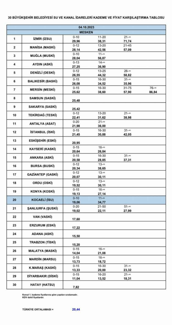 10 ton suya kadar Kocaeli'nin 20. sırada olduğunu belirten Başkan Acur, "Peki, 10 tondan sonra durum ne? Kocaeli, 10 tondan sonra suyun en pahalı olduğu illerden birisi. Birkaç örnek vereyim: 10 tondan sonra İstanbul’da su fiyatı 30,88 TL, Ankara’da ise 28,85… Kocaeli’de ise 34,77 TL… Dahası birçok ilde fiyat artışı 10 tondan sonra değil, 13 ya da 20 tondan sonra uygulanıyor. Örneğin Antalya’da 20 tona kadar su fiyatı 21,98 TL. Vatandaşlarımızın büyük bir bölümünün 10 tondan fazla su harcadığı düşünülürse, Kocaeli’de su fiyatı ifade edildiği gibi 19,06 TL değil, 34,77 TL’dir. İSU Genel Müdürlüğü halkı aldatmayı bırakmalı, 10 tondan sonra kullanılan suyun fiyatını makul bir noktaya çekmelidir" çağrısında bulundu.