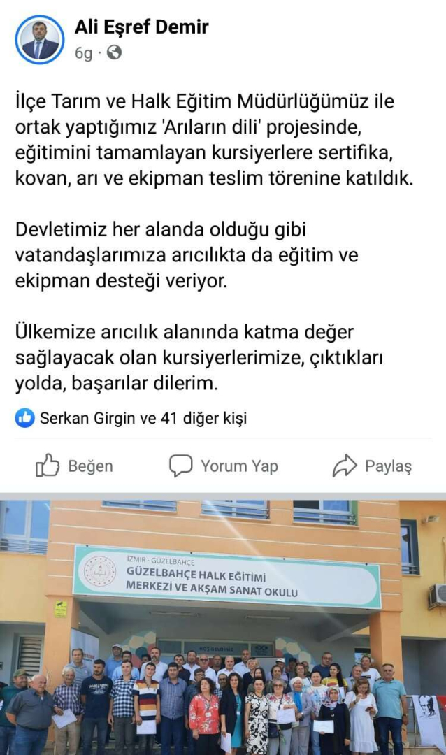 Bilgen açıklamasında, “AKP İlçe Başkanı Ali Eşref Demir, sosyal medya hesabından yaptığı paylaşımda , ‘İlçe Tarım ve Halk Eğitim Müdürlüğümüz ile ortak yaptığımız ‘Arıların Dili’ projesinde, eğitimini tamamlayan kursiyerlere sertifika, kovan , arı ve ekipman teslimine katıldık’ diyor.” AKP Güzelbahçe İlçe Başkanlığı bu projenin neresinde? Projedeki ortaklığı nedir? Yalnızca sertifika dağıtımında yer alarak şov kısmına mı ortak oldu? Yaklaşık 40 kişiyle başlayan kurslar neden üç ayda sona erdi?" şeklinde sorular yöneltti.