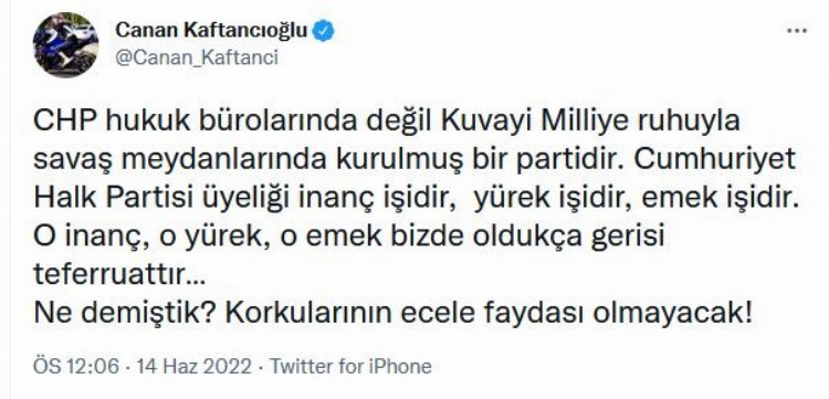 Kaftancıoğlu kararın ardından sosyal medya hesabından yaptığı paylaşımında, "CHP hukuk bürolarında değil Kuvayi Milliye ruhuyla savaş meydanlarında kurulmuş bir partidir. Cumhuriyet Halk Partisi üyeliği inanç işidir, yürek işidir, emek işidir.O inanç, o yürek, o emek bizde oldukça gerisi teferruattır…Ne demiştik? Korkularının ecele faydası olmayacak!" ifadelerini kullandı.