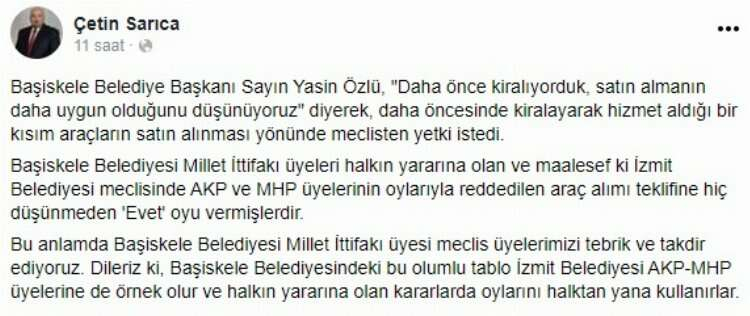 Sarıca sosyal medyada yaptığı paylaşımda, “Başiskele Belediye Başkanı Sayın Yasin Özlü, “Daha önce kiralıyorduk, satın almanın daha uygun olduğunu düşünüyoruz” diyerek, daha öncesinde kiralayarak hizmet aldığı bir kısım araçların satın alınması yönünde meclisten yetki istedi. Başiskele Belediyesi Millet İttifakı üyeleri halkın yararına olan ve maalesef ki İzmit Belediyesi meclisinde AKP ve MHP üyelerinin oylarıyla reddedilen araç alımı teklifine hiç düşünmeden ‘Evet’ oyu vermişlerdir. Bu anlamda Başiskele Belediyesi Millet İttifakı üyesi meclis üyelerimi tebrik ve takdir ediyoruz. Dileriz ki, Başiskele Belediyesindeki bu olumlu tablo İzmit Belediyesi AKP-MHP üyelerine de örnek olur ve halkın yararına olan kararlarda oylarını halktan yana kullanırlar” ifadelerine yer verdi.