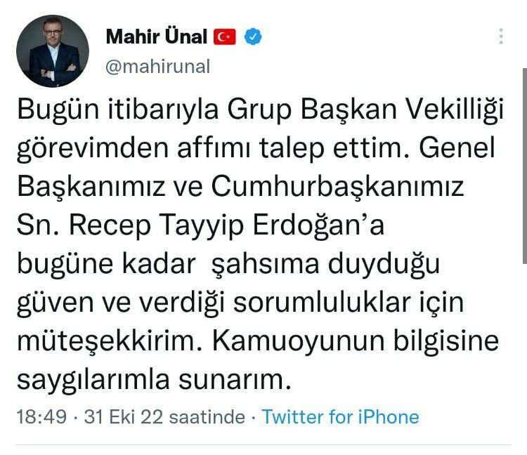 Ak Parti Grup Başkanvekili ve Kahramanmaraş Milletvekili Mahir Ünal sosyal medya hesabından Grup Başkanvekilliği görevinden istifa ettiğini duyurdu.