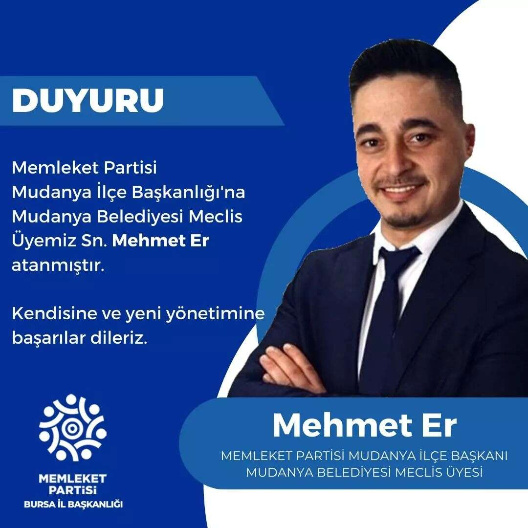 BURSA (İGFA) - Bursa’da Memleket Partisi’nin tek belediye meclis üyesi olan Mudanya Belediye Meclis Üyesi Mehmet Er, Mudanya İlçe Başkanlığı’na atandı.