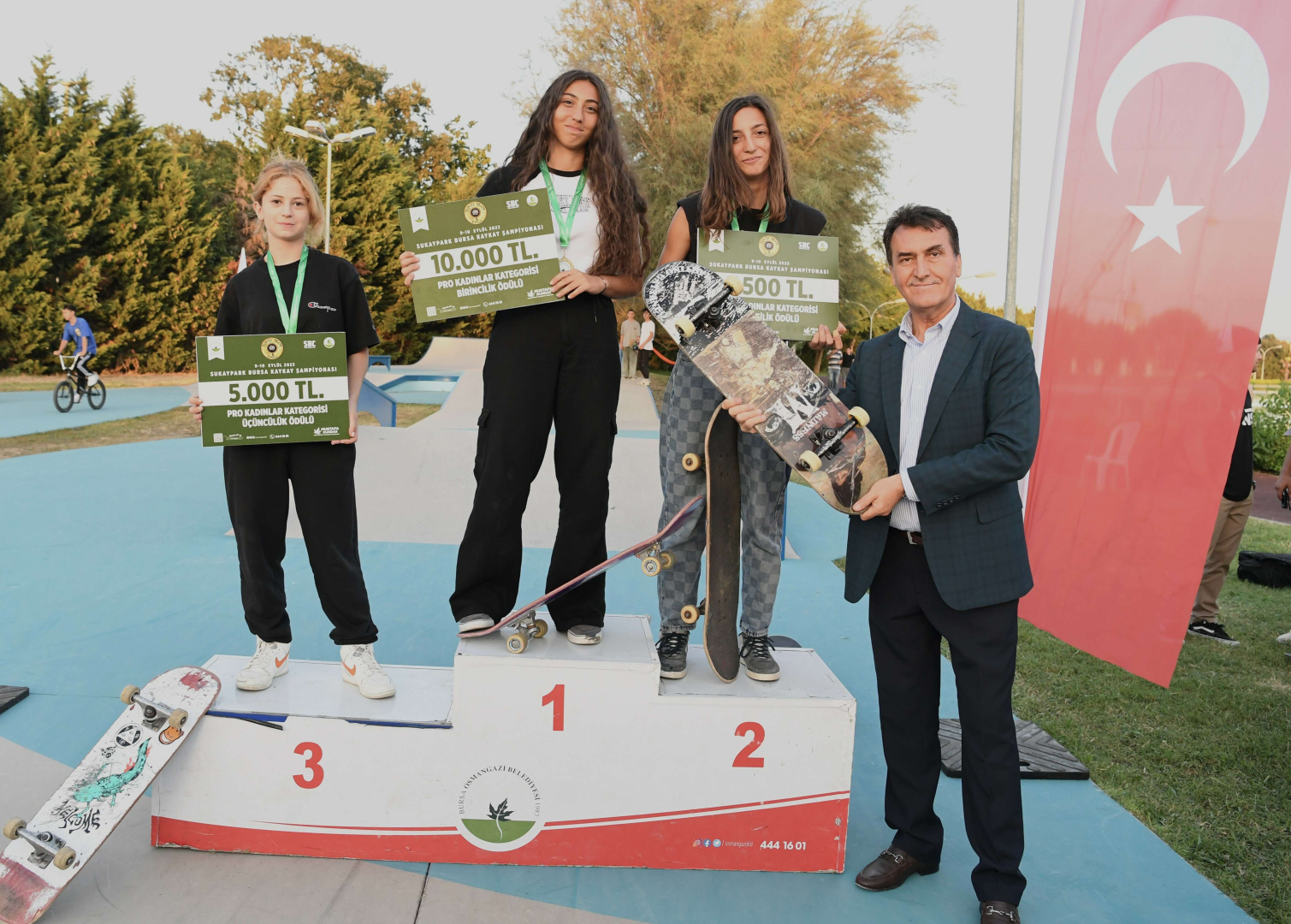 Dereceye giren sporcuların ödüllerini ise Osmangazi Belediye Başkanı Mustafa Dündarverdi.Sporcuları tebrik eden Başkan Dündar, “Bu tesis Türkiye’nin en iyi kaykay tesisi. Biz bu tesisi 2017 yılında açtık ve o günden bugüne burada böyle ikinci etkinliği yapıyoruz. Sporcularımızın burayı daha aktif kullanması lazım, buraya daha çok gelmeliyiz bu etkinlikleri daha çok yapmalıyız. Bu tesis kaykaycıların burayı aktif şekilde kullanalım. Şampiyonaya katılan herkese teşekkür ediyorum. Çok güzel yarışlar ortaya çıktı. Bu yarışlara katılan herkese teşekkür ediyorum” dedi.