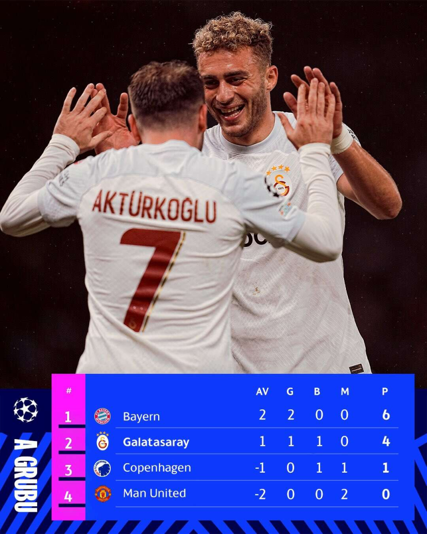 Galatasaray'ın gollerini 23. dakikada Wilfried Zaha, 71’de Kerem Aktürkoğlu ve 81’de Mauro Icardi kaydetti. Manu 17 ve 67’de Rasmus Hoejlund ile skor buldu. Aslanlar, 4 puanla ikinci sıraya yerleşirken, Bayern Münih ise 6 puanla zirvede yer aldı.