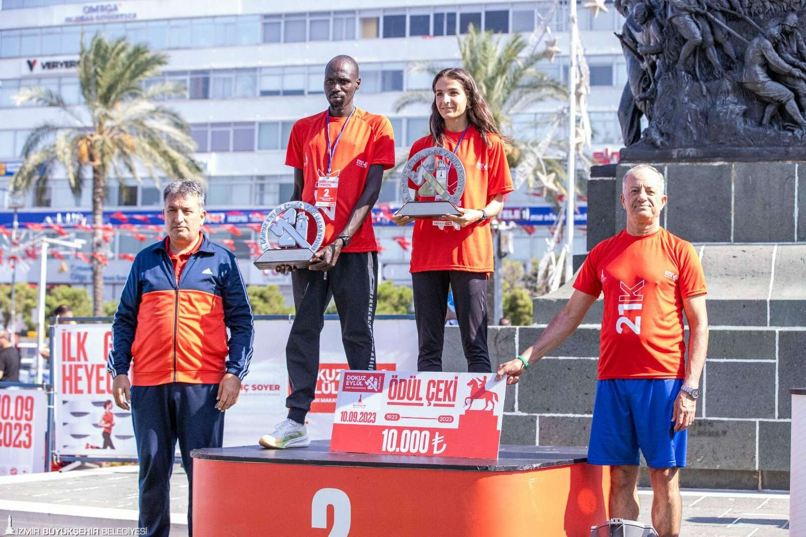 İZMİR (İGFA) - İzmir Büyükşehir Belediyesi’nin düzenlediği 11. Uluslararası 9 Eylül İzmir Yarı Maraton, İzmir'in düşman işgalinden kurtuluşunun 101. yılında büyük heyecana sahne oldu. 2 bin 500 kişinin yarıştığı maratonda; Türk erkeklerde birinciliği Ramazan Baştuğ, kadınlarda ise Bahar Atalay elde etti. Genel klasman erkeklerde Kenyalı Frankline Keitanyi altın madalyaya ulaşırken, yine Kenyalı Meshack Kimutai Kibil ikinciliği, Ramazan Baştuğ ise üçüncülüğü aldı. Kadınlarda Kenyalı Ivyne Jeruto Lagat birinci, Bahar Atalay ikinci, Dilan Atak ise üçüncü olarak koşuyu tamamladı. İzmirliler, maratona katılan sporcuları yarış güzergahı boyunca alkışlayarak destekledi. Yarışta İzmir Büyükşehir Belediyesi Genel Sekreter Yardımcısı Ertuğrul Tugay da koştu.