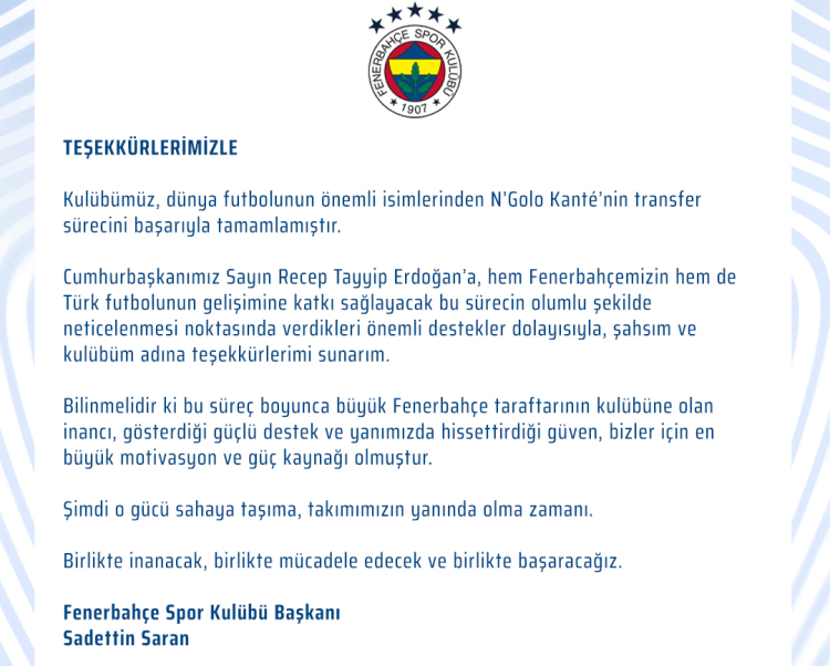 İSTANBUL (İGFA) - Fenerbahçe Spor Kulübü, dünya futbolunun yıldız isimlerinden N’Golo Kanté’nin transferini başarıyla sonuçlandırdı. Kulüp Başkanı Sadettin Saran, transfer sürecine ilişkin yaptığı yazılı açıklamada hem camiaya hem de kamuoyuna önemli mesajlar verdi.
