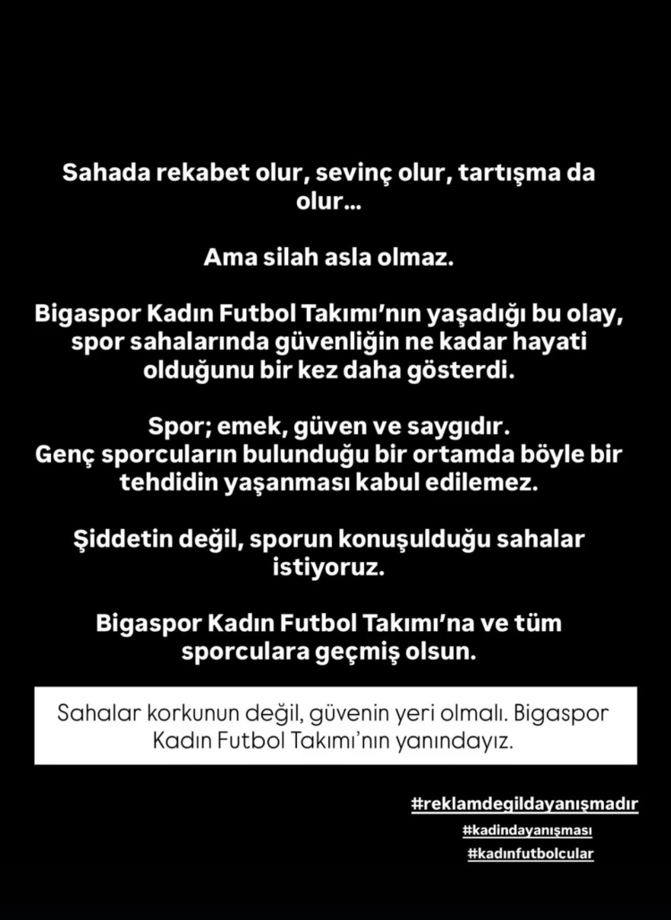 Hem yeşil sahalardaki yeteneğiyle hem de güzelliğiyle dikkat çeken başarılı futbolcu oyuncu ve fenomen Nevide Çiçek, Bigaspor Kadın Futbol Takımı’nın yaşadığı silahlı tehdit skandalına sessiz kalmadı.