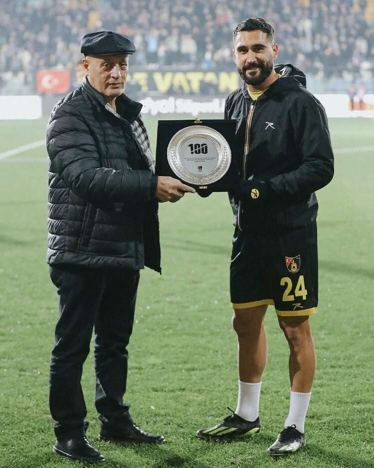 İstanbulspor Kulübü Başkanı Ecmel Faik Sarıalioğlu, Trabzonspor maçı ile 100. maçına çıkan profesyonel futbolcu Muammer Sarıkaya’ya karşılaşma öncesinde plaket takdim etmişti.