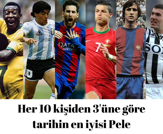 Katılımcıların %31’ine göre tarihin en iyi futbolcusu Pele olurken, %28’lik oranıyla Cristiano Ronaldo 2. sırada yer aldı. Futbolun global anlamda dünyada ses getirmesini sağlayan en büyük yeteneklerden olan Maradona ise ’lik oy alırken, Ronaldo ile birlikte günümüzün bir diğer starı olan Lionel Messi ise ’lık oranıyla 4. sırada yerini aldı.