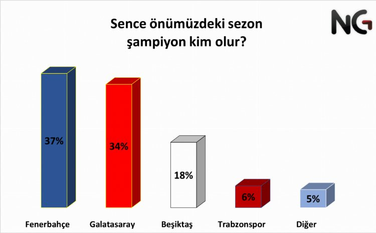 Yeni sezona güçlü bir kadro ve yeni teknik direktörüyle giriş yapan Fenerbahçe yüzde 37'lik oranıyla ilk sırayı alırken, takımın başına Okan Buruk'u getiren Galatasaray ise yüzde 34'lük oranıyla 2. sırayı aldı. Yüzde 18’lik oranıyla ise Beşiktaş 3. favori konumunda yer aldı.