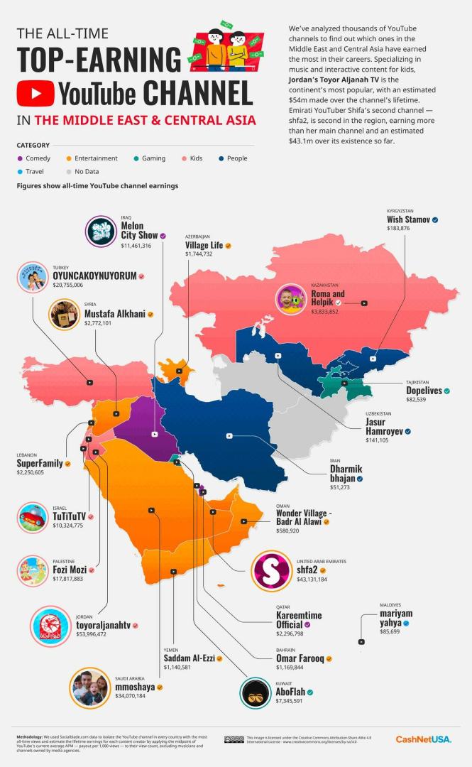 Orta Doğu ve Orta Asya bölgesinin en zengini 53 milyon dolardan fazla gelirle Toyor Al Janah oldu. 1994 yılında Ürdünlü iş adamı Khaled Maqdad tarafından kurulan Toyor Al Janah, 2008’de YouTube’a geçiş yapmadan önce yayın hayatına bir çocuk TV kanalı olarak başlamıştı.