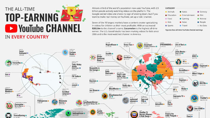 Ülkelere göre en çok gelir sağlayan YouTube kanalları belli oldu. Liste incelendiğinden dünyada en çok rağbet gören YouTube içeriklerinin çocuklara yönelik olduğu görülüyor