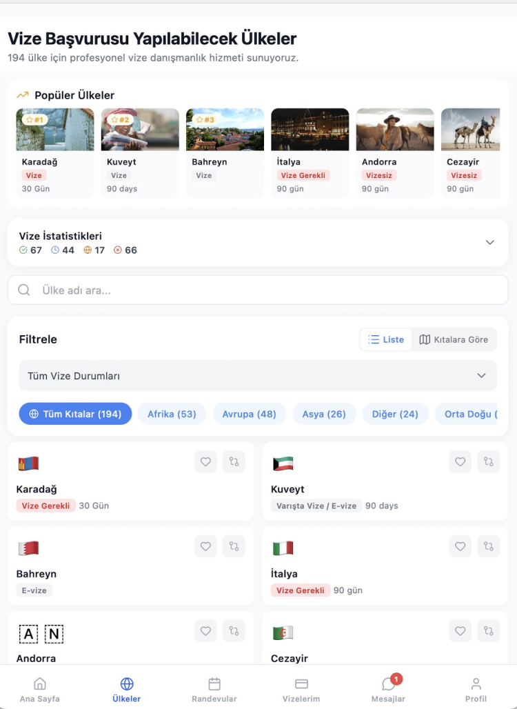 Platform, Türkiye Cumhuriyeti vatandaşları için 194 ülkenin vize durumu hakkında güncel ve karşılaştırmalı bilgiler sunuyor. Kullanıcılar tek bir sistem üzerinden; vizesiz seyahat edilebilen ülkeleri, varışta vize uygulanan destinasyonları, e-vize ile giriş yapılabilen ülkeleri ve konsolosluk başvurusu gerektiren ülkeleri görüntüleyebiliyor.