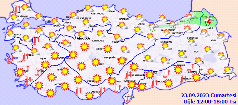 Parçalı ve az bulutlu, kuzeydoğu kesimleri yer yer çok bulutlu, Ardahan ile Kars'ın kuzey kesimlerinin yerel sağanak ve gök gürültülü sağanak yağışlı geçeceği tahmin ediliyor.