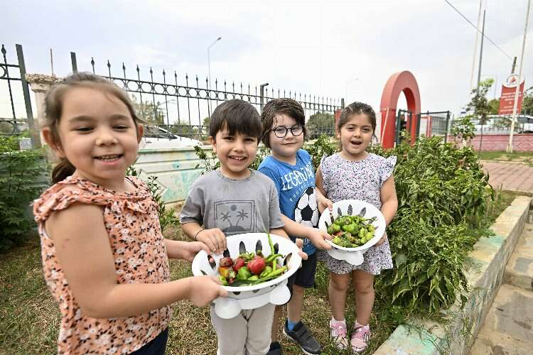 Çocuklar, can suyunu vermeyi de ihmal etmedi. Seralarını eken minik öğrenciler, ardından kreşin bahçesinde yiyecekleri biberleri bir sepete topladı.