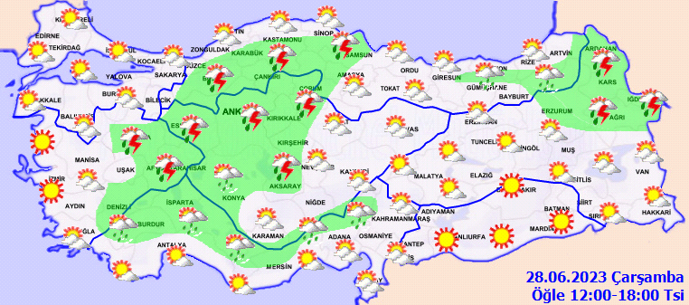 Ülkemizin kuzey ve iç kesimlerinin parçalı, yer yer çok bulutlu, Trakya'nın kuzeydoğusu, Ege'nin doğusu, Batı Akdeniz'in iç kesimleri ile Doğu Akdeniz'in Toroslar mevkii, İç Anadolu'nun kuzey ve batısı, Batı Karadeniz'in iç kesimleri ve Samsun çevreleri, Doğu Karadeniz kıyı kentlerinin iç kesimleri ve Doğu Anadolu'nun kuzeydoğusunun yerel sağanak ve gök gürültülü sağanak yağışlı, diğer yerlerin az bulutlu ve açık geçeceği tahmin ediliyor.