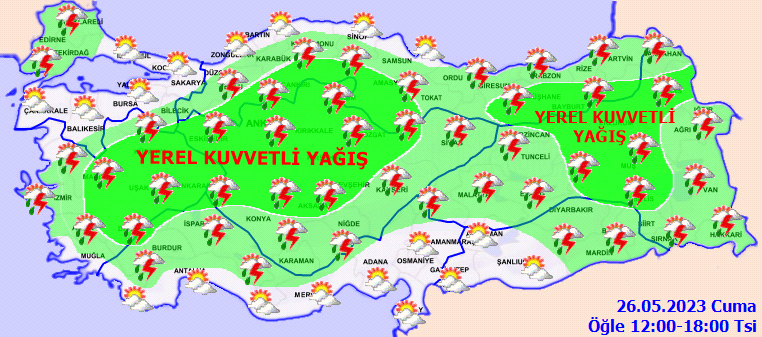 KUVVETLİ YAĞIŞ UYARISI: Yağışların; İç Ege, İç Anadolu'nun kuzeybatısı, Doğu Karadeniz'in iç kesimleri ile Aksaray, Nevşehir, Yozgat, Erzurum, Kars, Bingöl, Muş ve Bitlis çevrelerinde yerel kuvvetli olması beklendiğinden ani sel, yerel su baskını, yıldırım, ulaşımda aksamalar, yağış anından kuvvetli rüzgâr, dolu yağışı gibi olumsuzluklara karşı dikkatli ve tedbirli olunmalıdır.