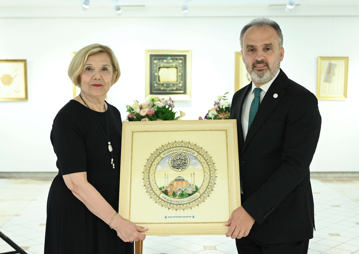 Bursa Büyükşehir Belediye Başkanı Alinur Aktaş da sergi ziyaret ederek Tezhip sanatçısı Memnune Birkan’ı tebrik etti.
