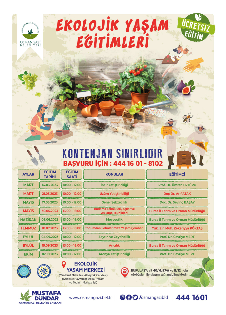 Bu çalışmalarını ‘Ekolojik Yaşam Eğitimleri’ ile taçlandırmaya hazırlandıklarını söyleyen Osmangazi Belediye Başkanı Mustafa Dündar, sınırlı kontenjanın olduğu programa herkesi davet etti.
